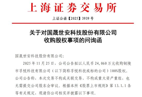 公告袒露当晚,国晟科技即收到上海证券来往所下发的《对于对国晟世安科技股份有限公司收购股权事项的问询函》。